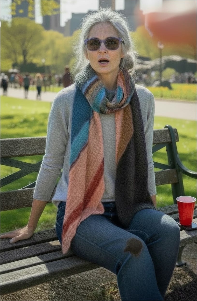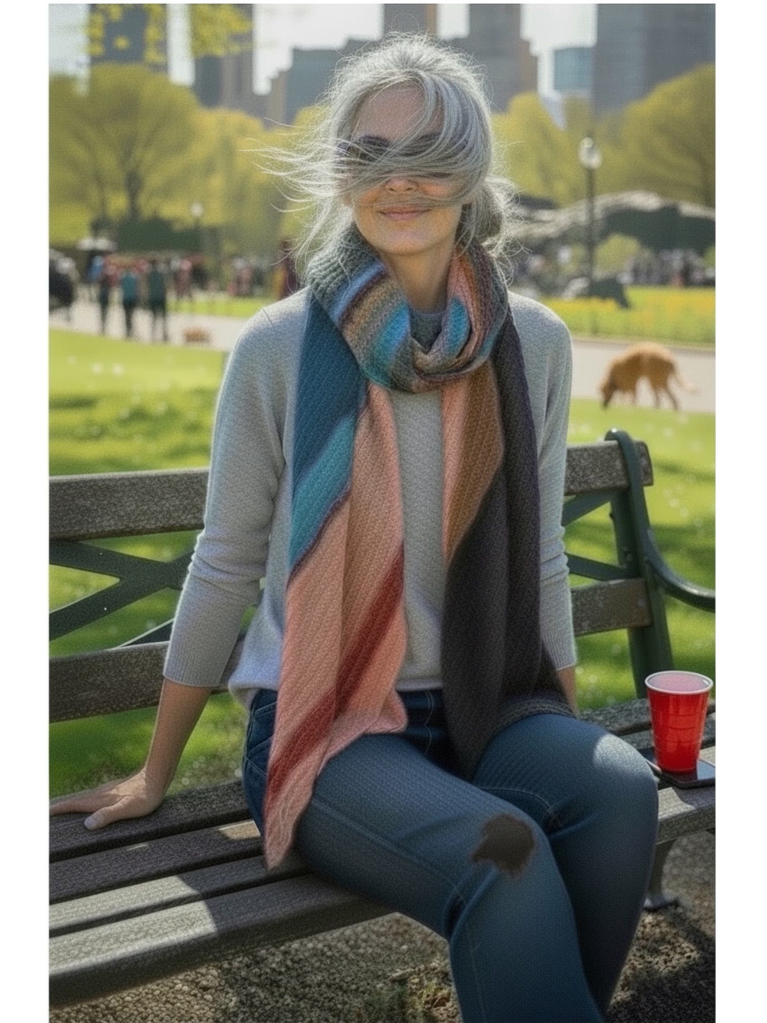 I had to do it. I went back to AI and put a heavy dose of reality into the mix. Make her over 55. Menopausal. Make her hair gray. No—grayer. Make her hair wiry on top, untamable by even the best hairspray. Give her a stain on the knee of her jeans. Put her cell phone on the bench, alongside a plastic cup someone left behind and the photo/model team forgot to take out of the frame. Put some hair across her face because the breeze kicked up at just the wrong moment. Then add a dog getting ready to do its business just as the photo is taken. Oh, and make sure to leave a bit of the photographer’s finger in the frame. Reality? In our world… probably, yes. All of that. Oddly, adding all of that made the Lost River Shawl itself look far less… real.